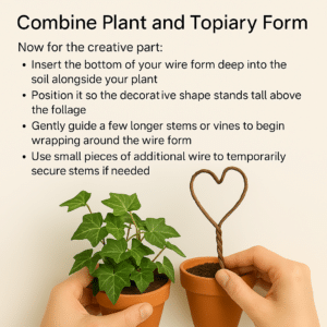 - Position it so the decorative shape stands tall above the foliage. Gently guide a few longer stems or vines to begin wrapping around the wire form.