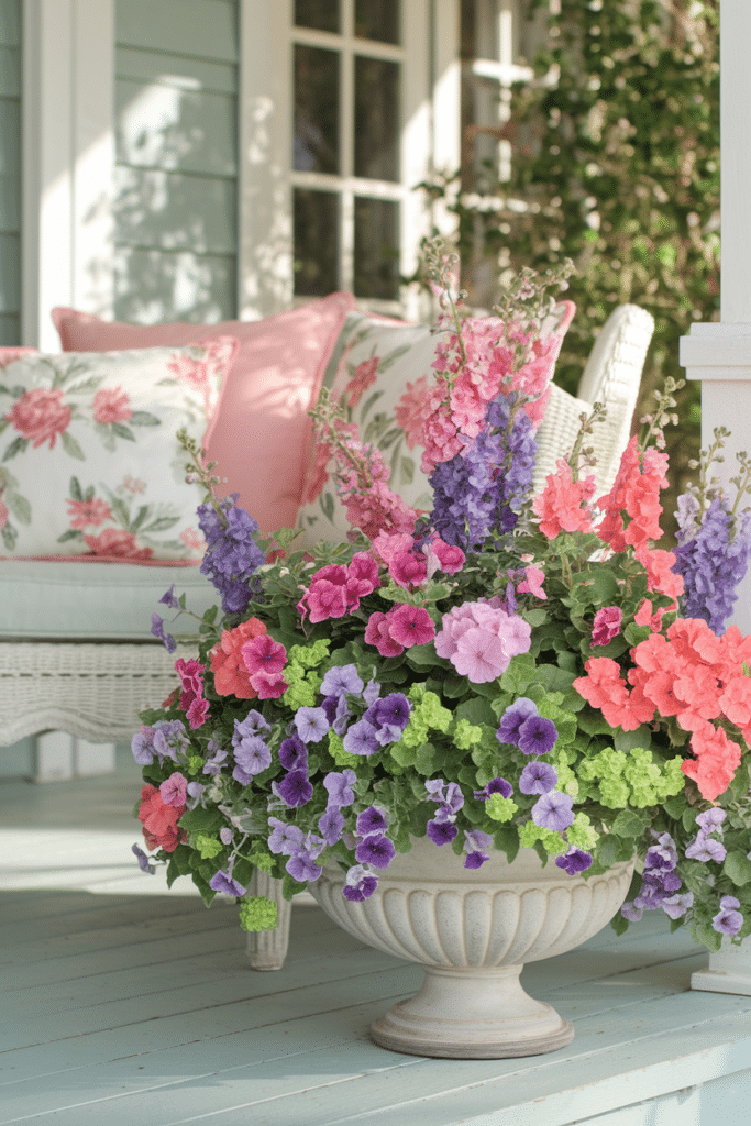 This bright and playful container flower design features vivid pinks and orchids paired with soft, silvery foliage. It’s a standout among porch planter ideas, especially in sunny spots where bold color can shine against wood, brick, or painted exteriors.